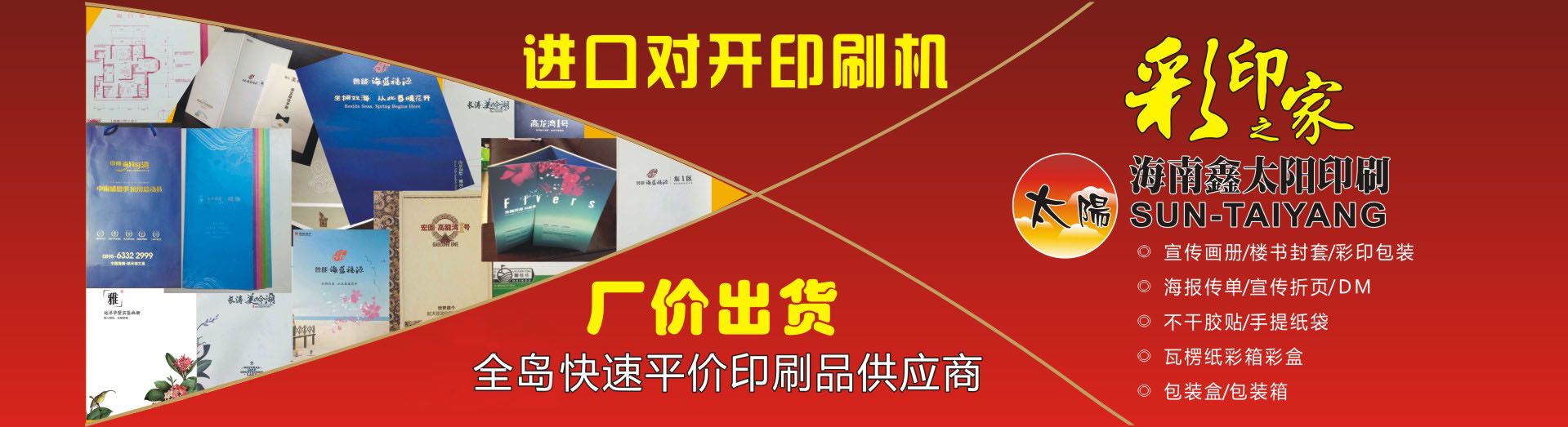 海南鑫太陽(yáng)印刷業(yè)有限公司成立于2002年,主要從事生產(chǎn)海報(bào)畫冊(cè)、傳單簡(jiǎn)介、精品包裝、掛歷臺(tái)歷、不干膠貼、手提紙袋、瓦楞紙包裝箱和彩箱紙盒等,公司有日本、德國(guó)等對(duì)開及四開高速彩色印刷機(jī)、自動(dòng)膠裝機(jī)、自動(dòng)鎖線機(jī)、自動(dòng)復(fù)膜機(jī)等先進(jìn)的自動(dòng)化設(shè)備,業(yè)務(wù)涉及商業(yè)、地產(chǎn)、水產(chǎn)、食品、農(nóng)林、藥品、化工、航空等行業(yè)的彩印包裝及宣傳印刷品。我公司另外還設(shè)有紙箱包裝廠,可以更好地為客戶配套生產(chǎn)各種檔次級(jí)別的瓦楞紙箱彩盒、普通紙箱紙盒、精裝禮盒等大型產(chǎn)品包裝,產(chǎn)品范圍包括花炮箱、飲料箱、食品箱、魚箱、花箱等。